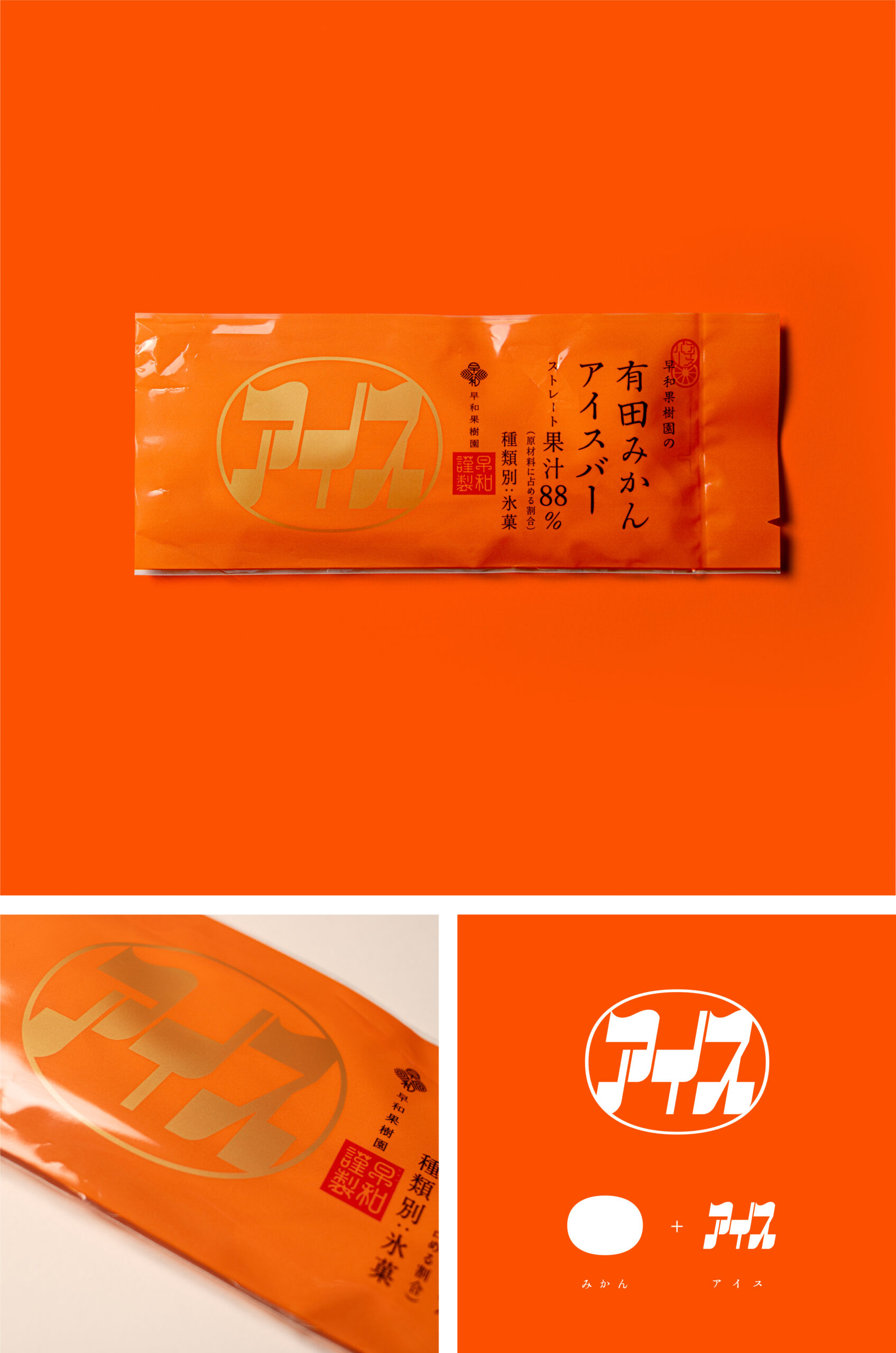 有田みかんアイスバー 早和果樹園のみかんを使用した商品「有田みかんアイスバー」のパッケージデザイン。みかんのシンプルなアイコンを商品に相応しいマークに作り変えることで、商品の特性を伝えています。みかんアイスのマークは、違うカテゴリーへの緩やかな統一性・連動性を考え、表現しています。 SOWA KAJUEN PACKAGE DESIGN etc... VIEW WEBSITE
